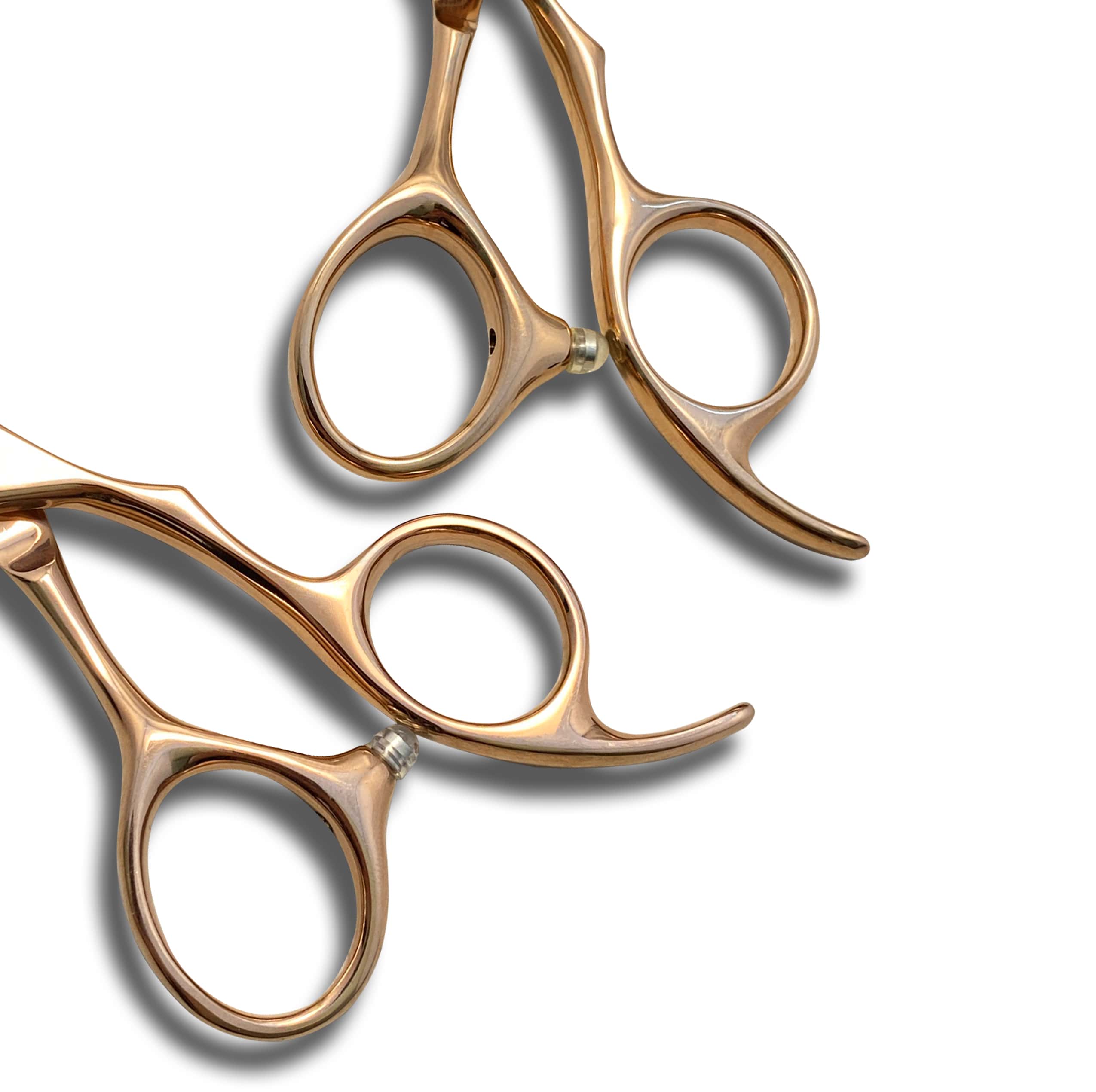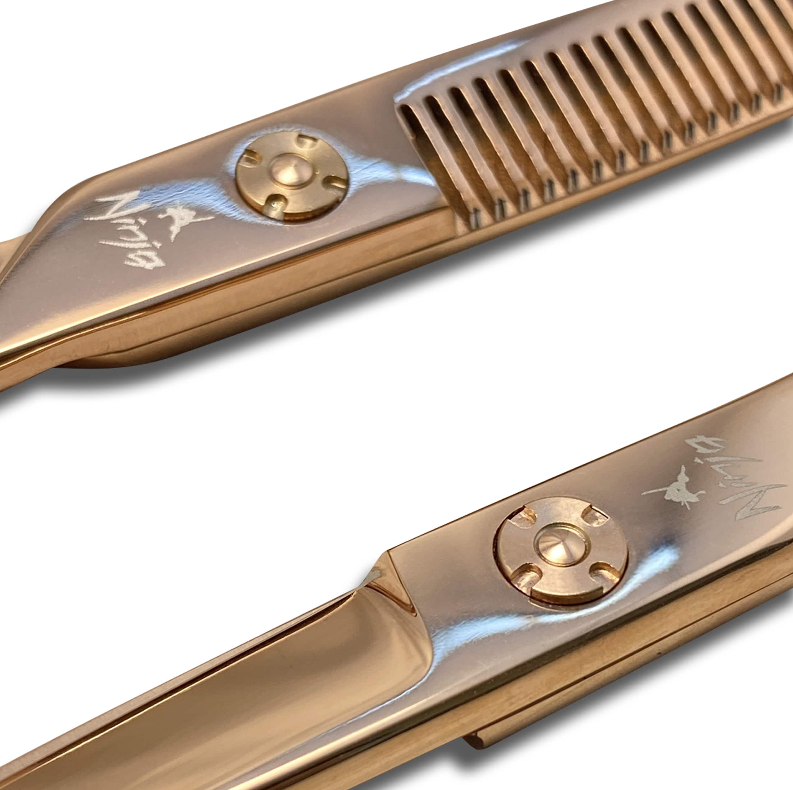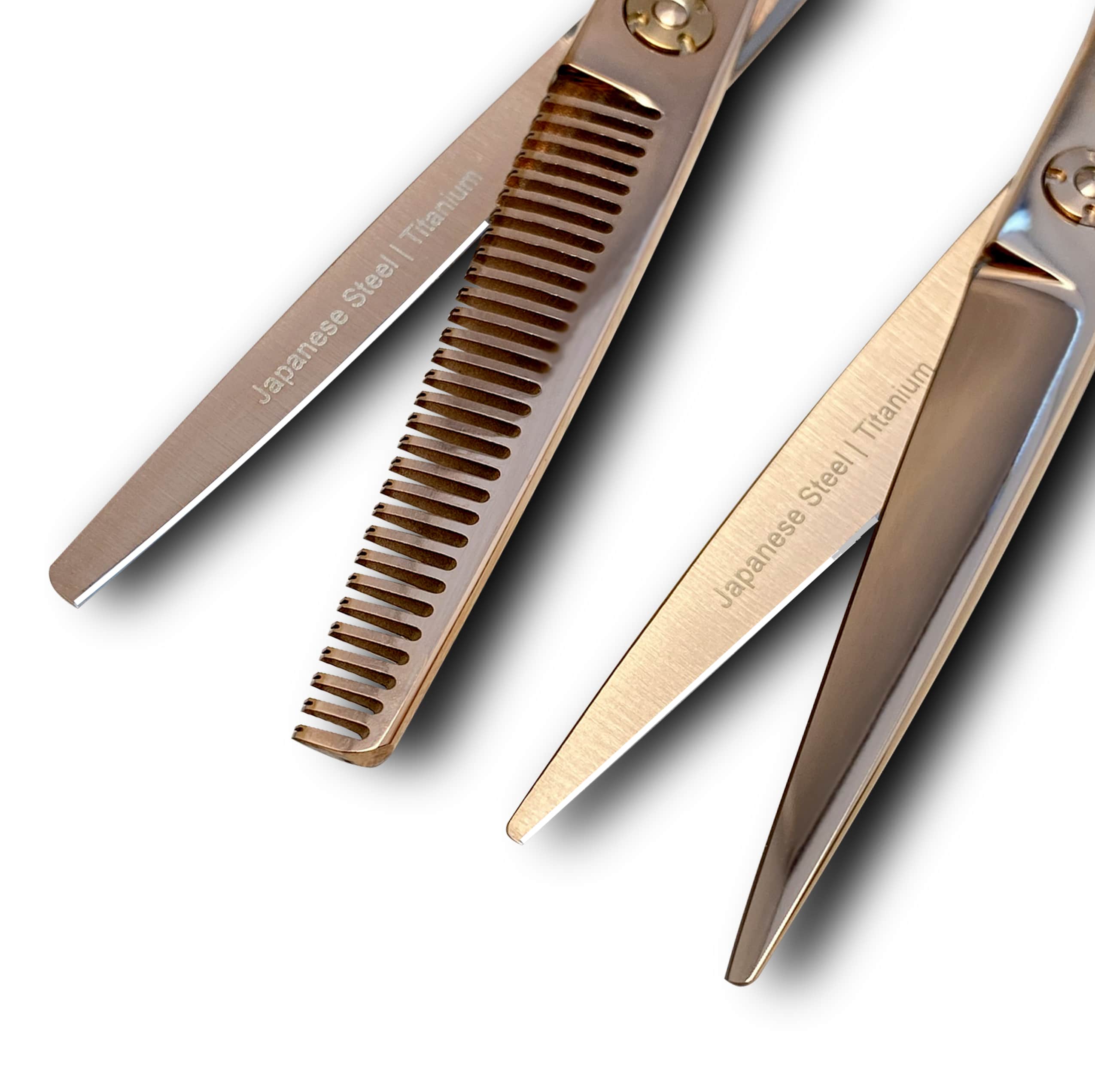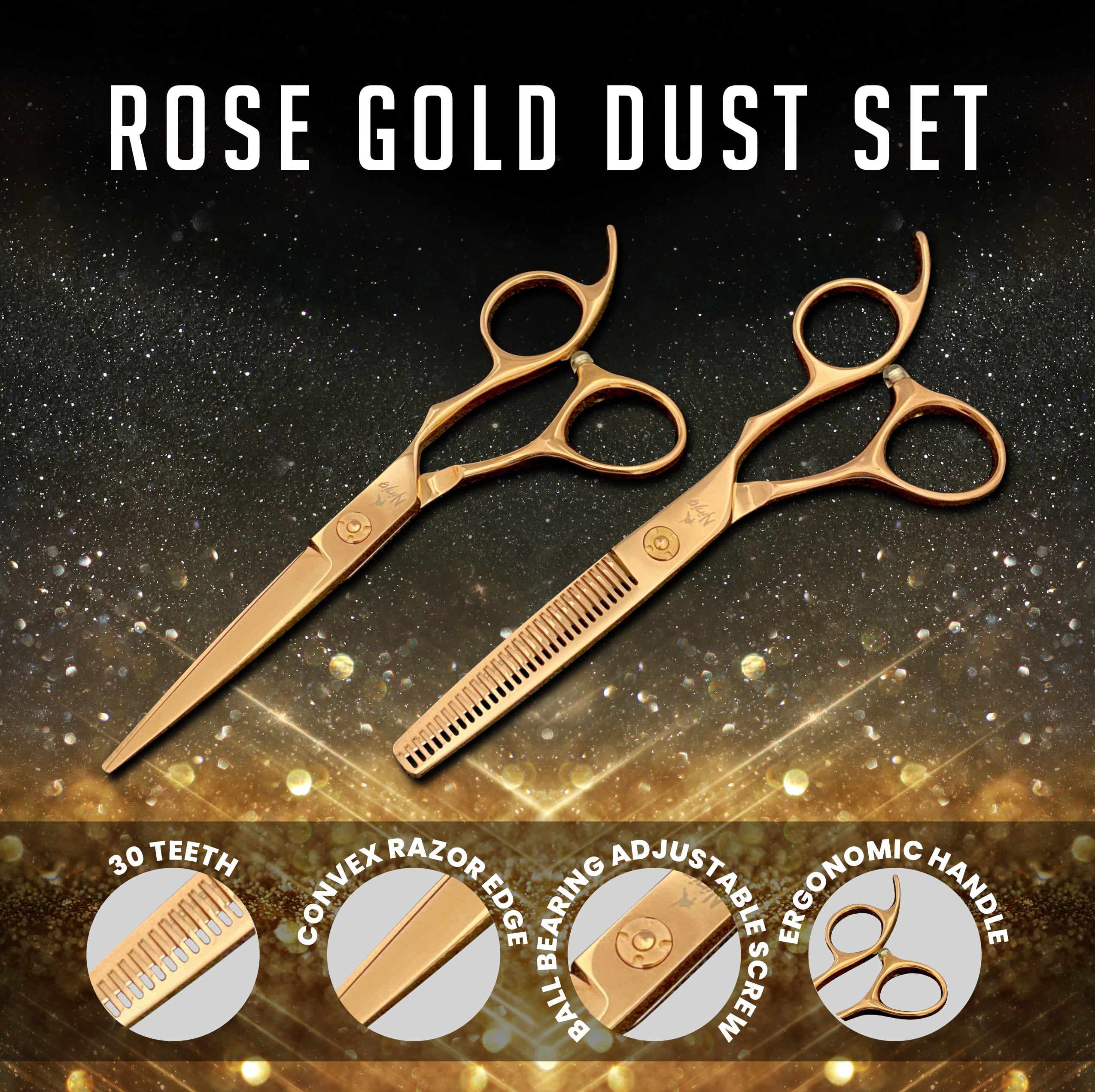 Rose Gold Dust é uma tesoura de desbaste ergonomicamente projetada, perfeita para todos os tipos de desbaste e mistura. O acabamento em titânio Gold Dust não só é lindo, mas também ajuda a protegê-lo contra alergia ao níquel. Estas tesouras de desbaste excepcionalmente afiadas e ergonomicamente projetadas são forjadas em aço japonês Premium 440C com infusão de cobalto. Adicione um pouco de cor ao seu estilo!